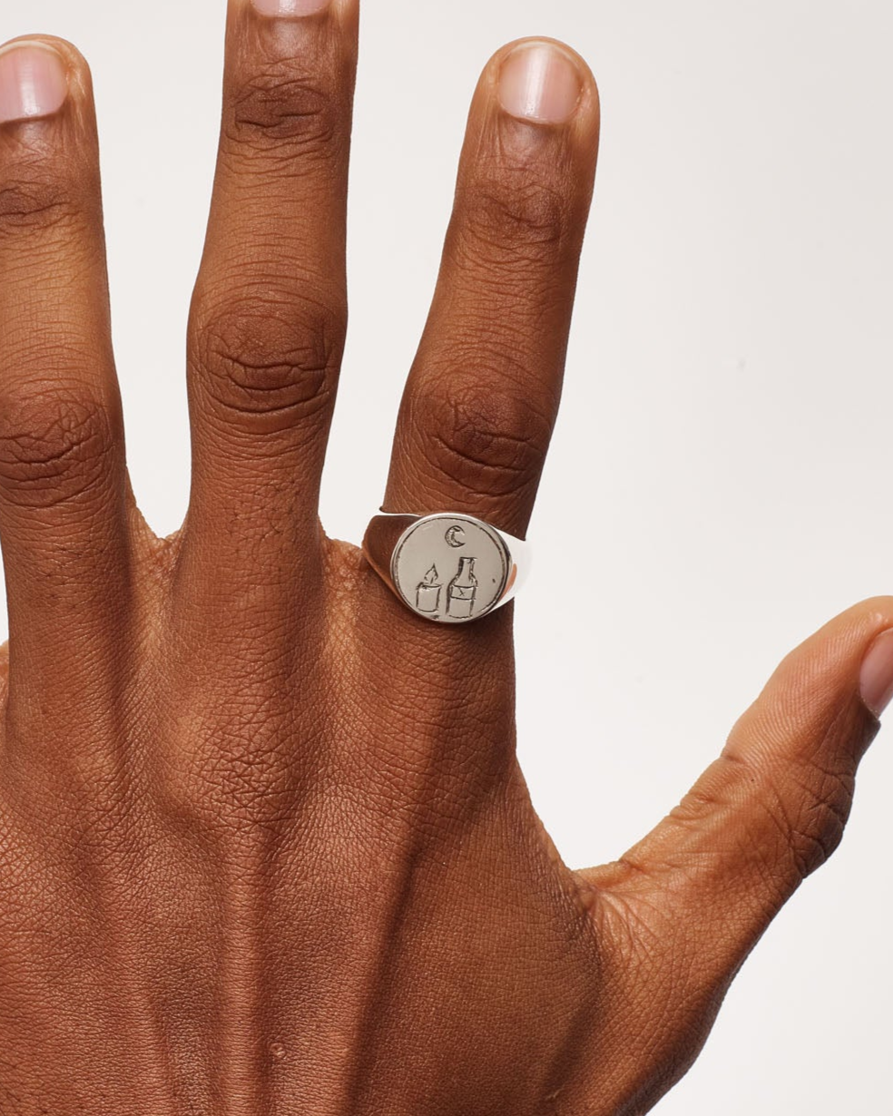 The Moonlight silver signet ring is one of our original and best selling engraved ring designs. Featuring a chunky silhouette this signet ring is perfect for your index or middle finger.