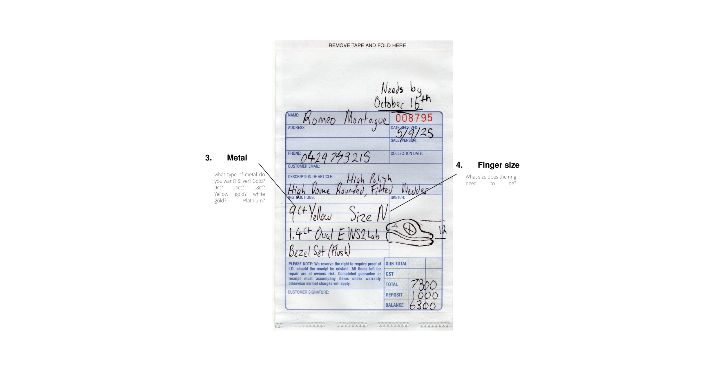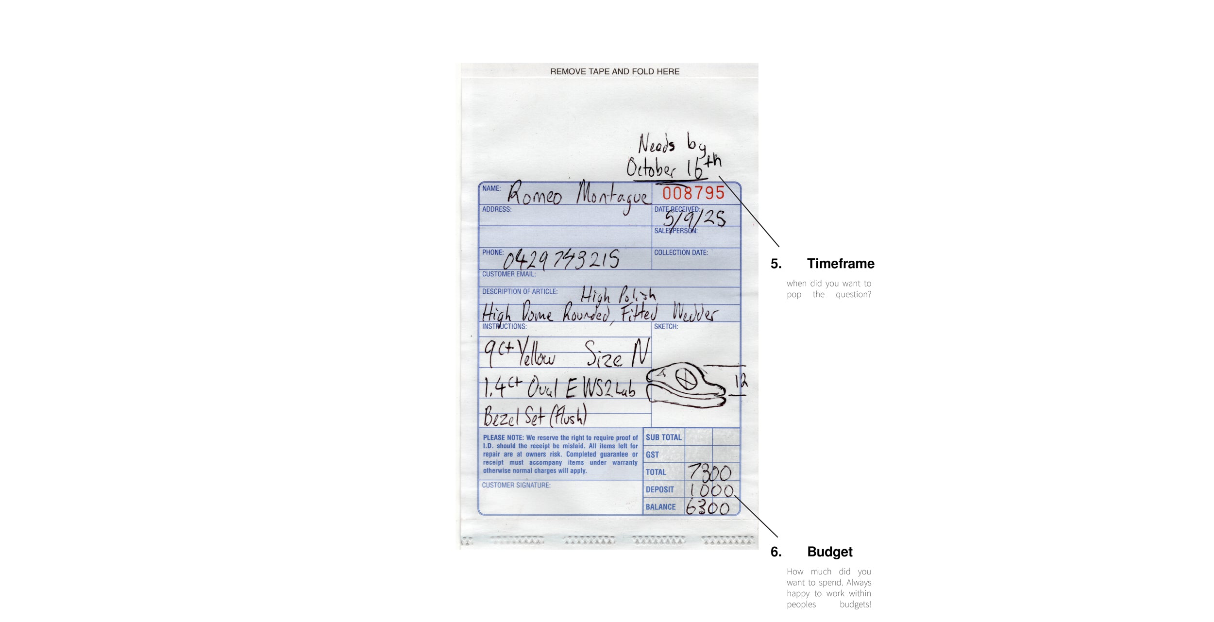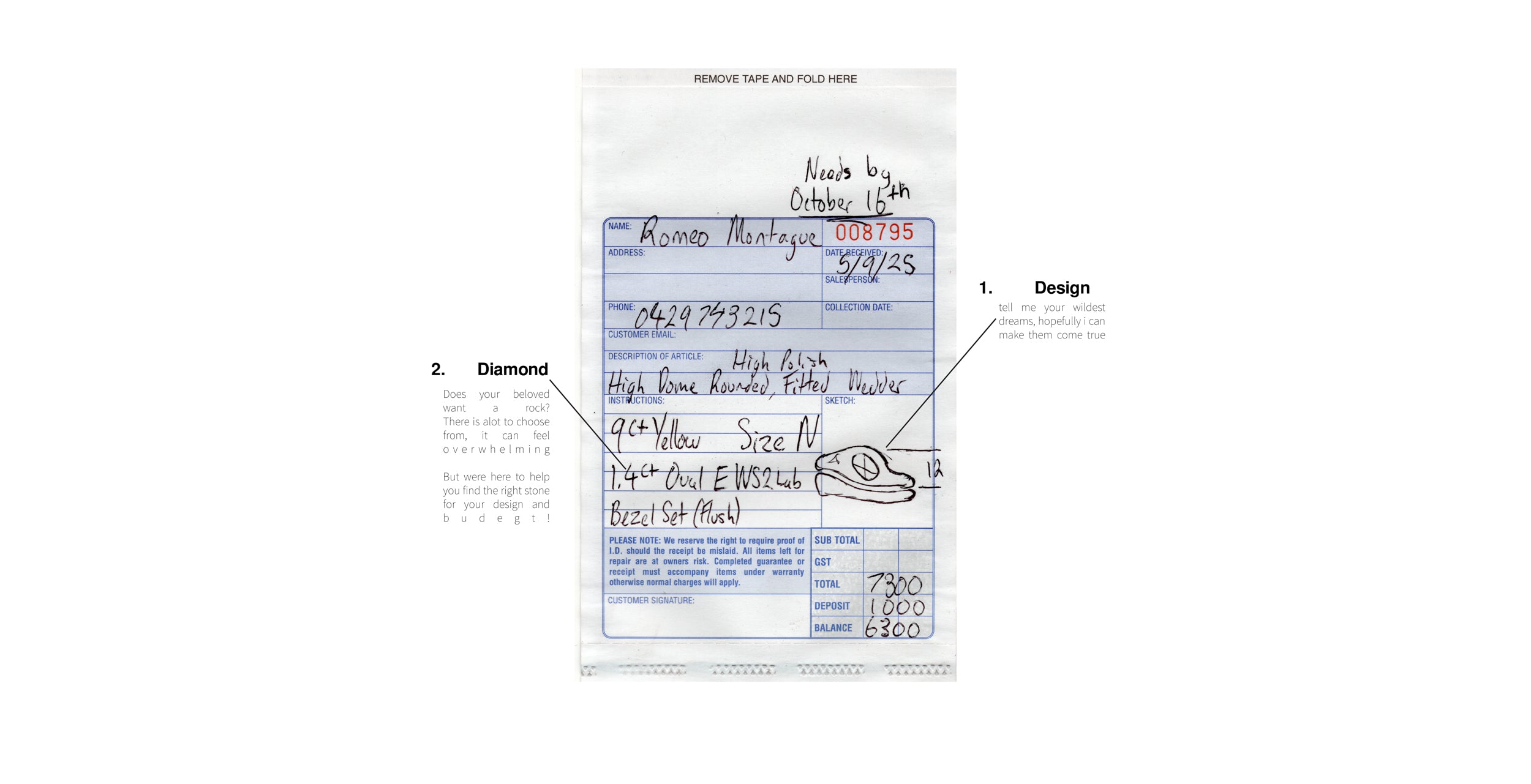 Once the design is locked in, give us 4–8 weeks to make it. Rushed timelines might be possible — but keep in mind, its just one person making all the custom pieces and there is a queue. But we understand sometimes the moment is urgent, and were happy to try and accomodate.